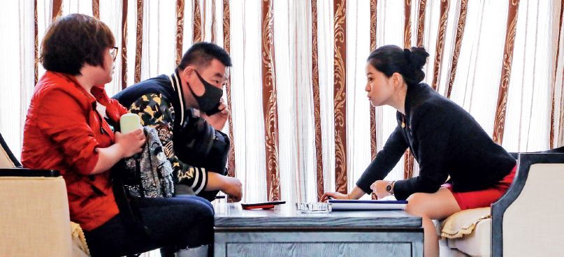 丹东某楼盘的销售人员(右)向看房者介绍情况。