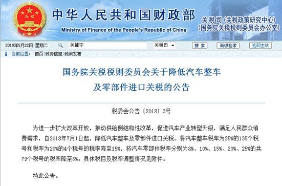 一味保护没有用,只有充分竞争,才有危机,才有动力。几天前,国家财政部宣布,从2018年7月1日开始,大幅降低汽车及零部件进口关税!