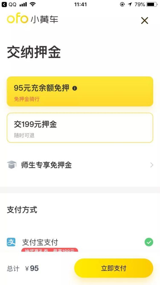 小黄车黄没黄,暂时还没有结论,但是它已经开始加速“卖广告”。有很多网友反映从上周开始本来免押金的小黄车开始需要押金,或者充值支付95元才能免押。