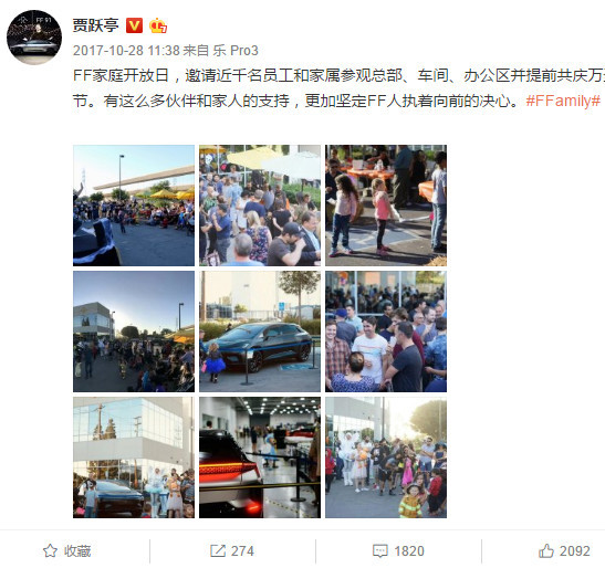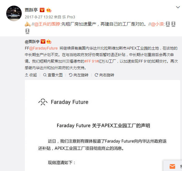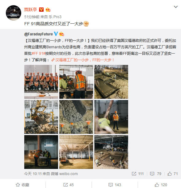 6月9日,Faraday Future认证微博发布消息称我们已经获得美国汉福德政府正式许可,委托加州商业建筑商Bernards为总承包商,负责建设占地一百万平方英尺的工厂(约9万平方米)。贾跃亭个人微博引用了Faraday Future,发了9张图,写了15个字——FF91高品质交付又近了一大步。