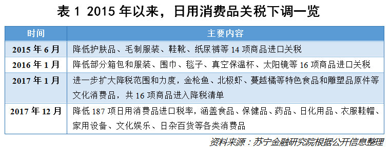 自2015年起,我国先后四次降低日用消费品的进口关税,范围和力度呈现逐步加大趋势(参见表1)。