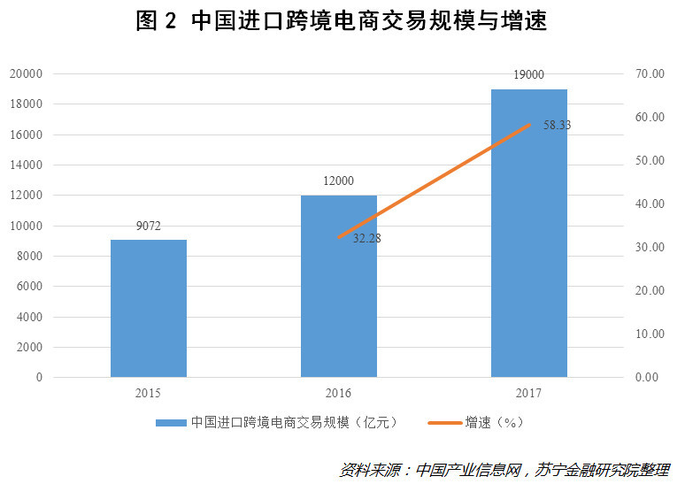 中国电子商务研究中心发布的数据显示,2017年中国进口跨境电商交易规模接近1.9万亿元,同比增长近60%(参见图2)。
