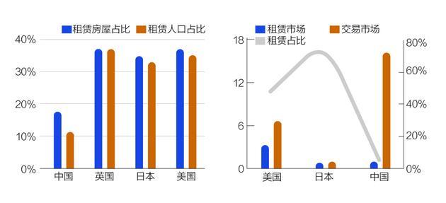 我国租赁人口及房屋比例 租赁与交易市场规模对比 数据来源:中国住房租赁蓝皮书 邹利制图