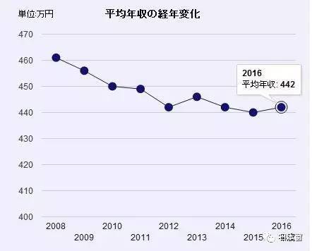 此外,从年度变化来看,自2008年起,日本人的平均工资收入一直持小幅度下降趋势。