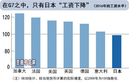 据经济合作与发展组织(OECD)统计,从剔除物价影响后的实际工资(按各国货币计算)来看,在日、美、德等七大工业国中,只有日本处于比2000年还低的水平。在过去20年里,在保持通货紧缩的背景下,很多日本企业认为,“如果人工费提高,国际竞争力将下滑”,因此一直不愿提高工资。