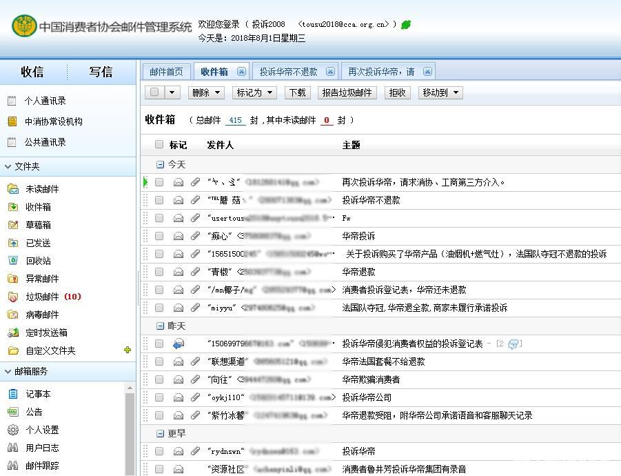 图:中消协收到消费者关于此事件的投诉邮件(部分内容截屏)