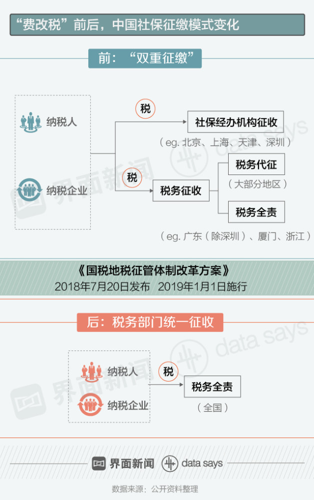 2018年7月20日,中共中央办公厅、国务院办公厅印发《国税地税征管体制改革方案》,宣布从2019年1月1日开始,将各项社会保险费交由税务部门统一征收。目前,税务总局、财政部、人社部、国家卫健委、国家医保局等五部门正在联合推动征管职责划转工作。
