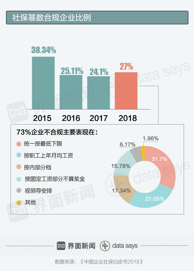 《中国企业社保白皮书2018》数据显示,2018年中国超过七成的企业没有按照国家规定为职工缴纳社保,其中32%都是按照国家规定的下限缴纳。也就是说,大多数职工都没有享受到应有的社保待遇。