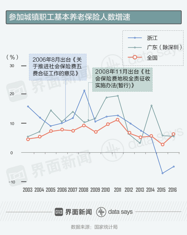 以浙江和广东(除深圳)为例,他们先后在2006年和2008年改为地税全责征收社保,此后几年,参保职工人数增速明显增长。