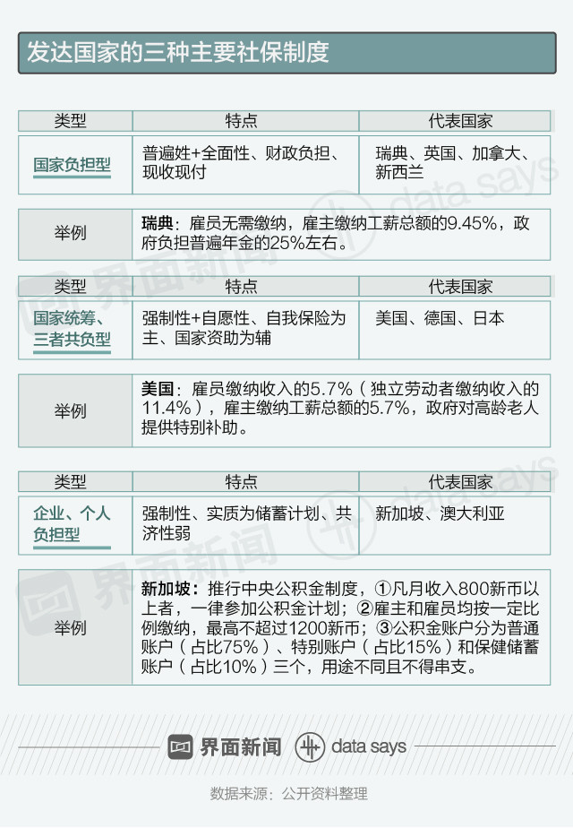 目前,发达国家的社保制度主要有三种:以瑞典为代表的国家负担型,以美国为代表的国家统筹、三者共负型,以新加坡为代表的企业、个人负担型。