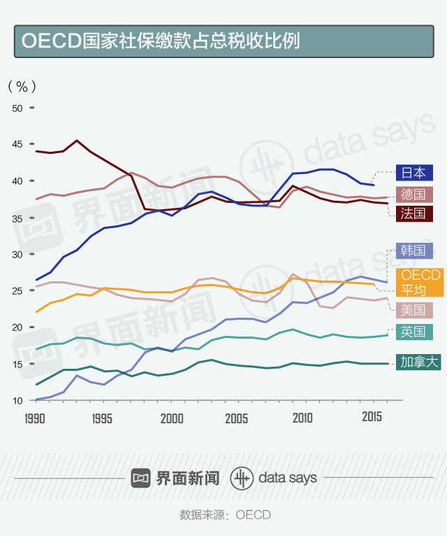从1990年至今社保缴款占比变化来看,日本、韩国迅速增长,英国、加拿大稳中有升,法国、德国、美国出现了不同程度的下降。
