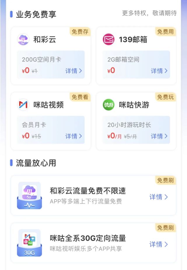 为所有移动用户,在除打电话上网外,还能免费享有网盘、视频会员、云游戏、云邮箱等数字化应用的生活娱乐权益。