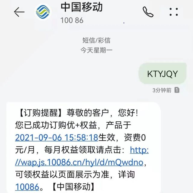 短信入口,发送特定指令至10086进行权益开关(开通指令:开通优+权益:KTYJQY;关闭指令:取消优+权益:QXYJQY)。