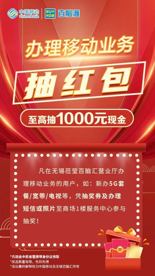 凡在无锡莅莹百脑汇营业厅办理移动业务的用户,如:新办5G套餐、宽带、电视等,凭抽奖券及办理短信或照片至商场1楼服务中心参与抽奖!