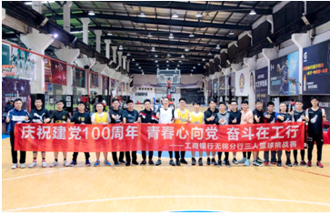 为庆祝建党100周年,展现员工风采,鼓励全员参与体育锻炼,增进互相交流沟通,营造快乐工作、健康生活的良好氛围,日前,中国工商银行无锡分行组织举办了“青春心向党奋斗在工行”三人篮球挑战赛。