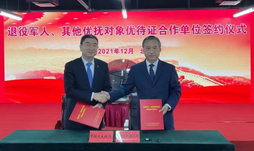 近日,中国光大银行作为唯一一家股份制商业银行参加退役军人事务部举办的“退役军人、其他优抚对象优待证(以下简称“优待证”)申领”启动仪式,并作为首批合作银行与退役军人事务部签署《退役军人、其他优抚对象优待证合作协议》。