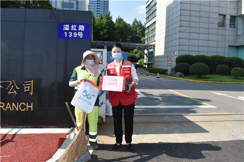 无锡移动滨湖营销中心“心级服务”志愿者团队走访滨湖区溢红路、大池路的环卫工人,亲手送上矿泉水、毛巾、花露水、扇子等防暑降温用品,用实际行动给他们送上实实在在的关怀,感谢环卫工人为辖区的整洁美丽做出的付出与贡献。