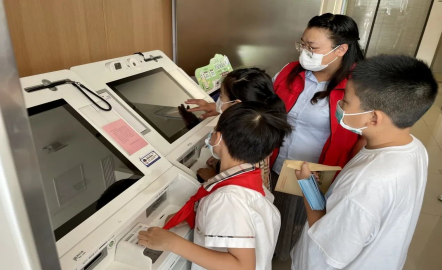 活动伊始,小朋友们参观了银行的各功能分区,体验了现金存取、ATM机、ITM机等智能终端自助设备。