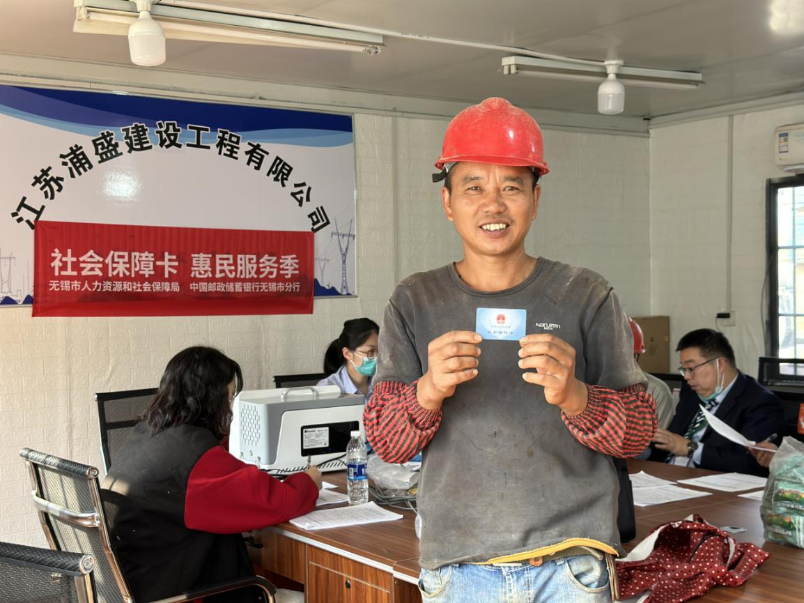 邮储银行无锡市分行考虑到江苏浦盛建设工程有限公司位处东北塘,地段偏远周边银行少、务工人员上工时间分散等特点,同时我行作为农民工工资保障代发行,第一时间联合无锡市人力资源和社会保障综合服务中心,携外拓便携式发卡设备共同为工地提供“社保—金融—交通”一体化的一篮子综合服务。较普通工资卡而言,这张邮储银行第三代社会保障卡能做到省内异地社保卡业务和金融业务通办,年费、小额管理费、挂失费、工本费、工资短信提醒等多项费用减免,支持代扣代缴水、电、燃气、通讯费等生活缴费,支持大额资金进出,还可以方便外来务工人员享受本地交通优惠,是一张同时满足务工人员社保、缴费、出行需求的工资卡。