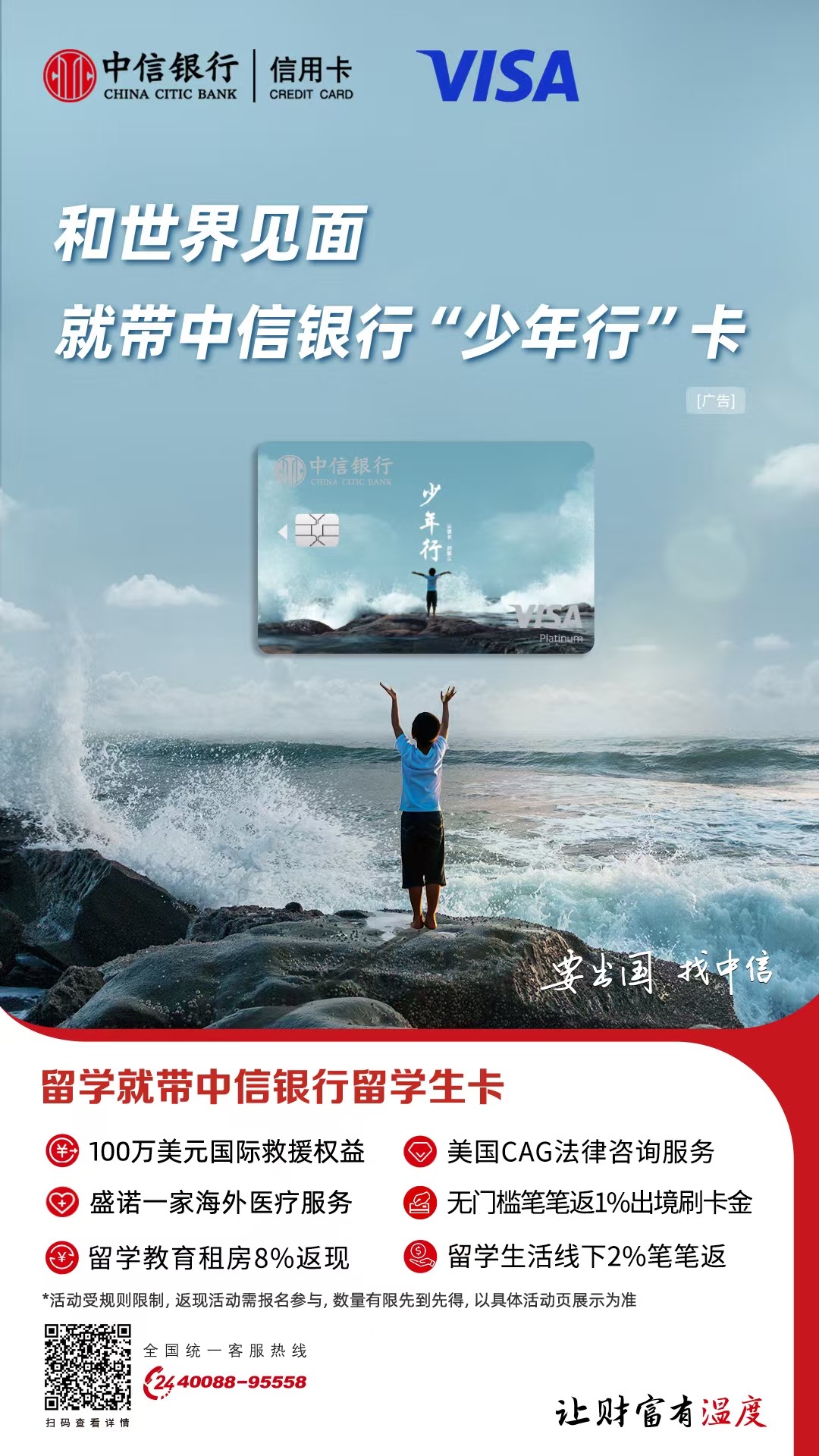 2025年秋季开学临近,中信银行为留学生提供免费专属权益——中信银行Visa少年行白金信用卡、美国地区高校免费接送机服务。中...